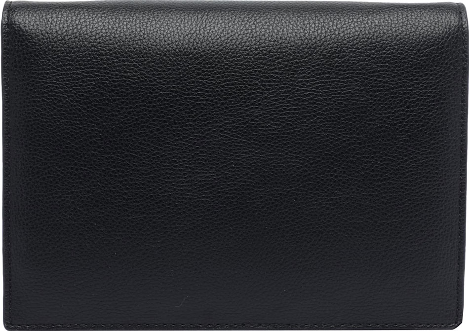 Закрывается клапаном на магнитную кнопку. Внутри одно основное отделение, разделенное карманом на молнии, и карман для кредитных карт. Съемный плечевой ремень-цепочка.
