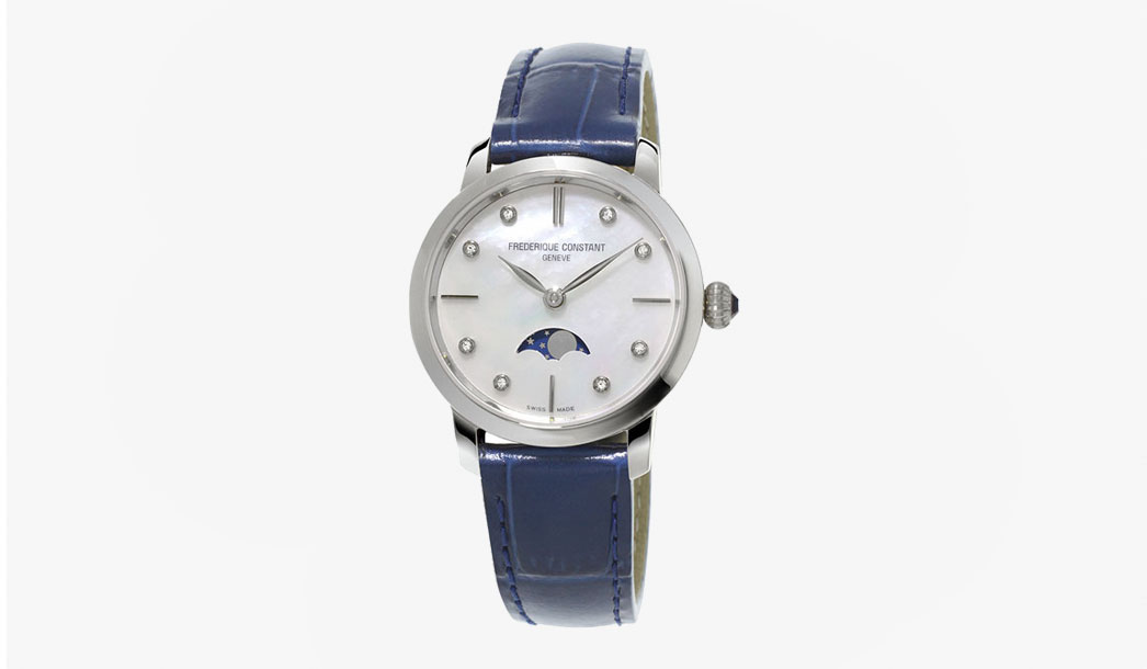 Slimline Moonphase (арт. FC-206MPWD1S6). Кварцевый механизм FC-206. Часы, минуты, фазы Луны. Корпус из стали, диаметр 30 мм, толщина 7,7 мм, водонепроницаемость 30 м. Сапфировое стекло, заводная головка с кабошоном из сапфира. Циферблат из перламутра, 8 бриллиантов. Кожаный ремешок.