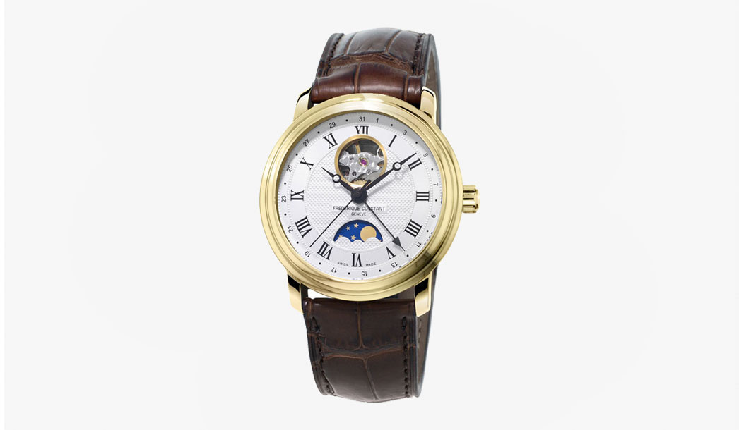 Classics Moonphase (арт. FC-335MC4P5). Калибр FC-335 Heart Beat с автоподзаводом, запас хода 38 часов. Три стрелки, дата, фазы Луны. Корпус из стали, с покрытием желтым золотом, диаметр 40 мм, толщина 10 мм водонепроницаемость 60 м. Сапфировые стекла с обеих сторон. Циферблат серебристый, гильошированный. Открытый узел «баланс-спираль». Коричневый ремешок из кожи аллигатора.