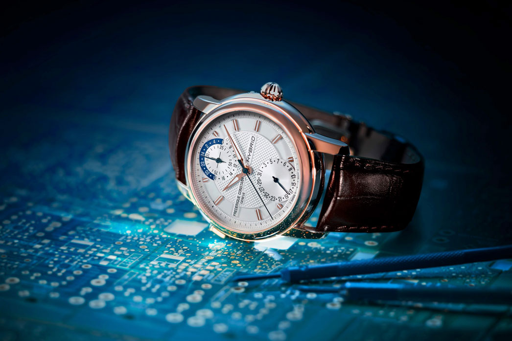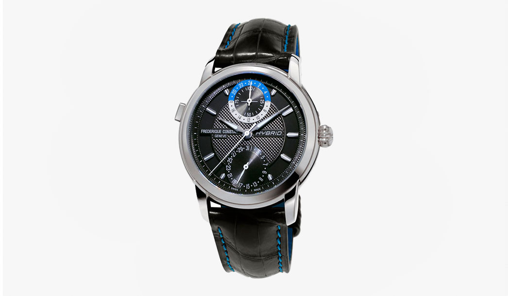 Hybrid Manufacture (арт. FC-750DG4H6). Калибр FC-750 с автоподзаводом, запас хода 42 часа; электронный модуль FC-750, заряд батареи 7 суток. Часы, минуты, секунды, дата, мониторинг активности, мониторинг фаз сна, динамический тренер, GMT, анализ работы механики, индикация заряда батареи, установка показаний кнопкой. Корпус из стали, диаметр 42 мм, сапфировые стекла с обеих сторон, водонепроницаемость 50 м. Циферблат темно-серый, гильошированный, серебристые накладные метки, полированные серебристые стрелки с белым люминесцентным покрытием. Темно-серый ремешок из кожи аллигатора. Тираж: 888 экз.