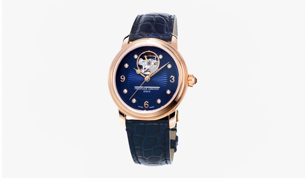 Heart Beat Ladies Automatic (арт. FC-310HBAND2P4). Калибр FC-310 Heart Beat с автоподзаводом, запас хода 38 часов. Часы, минуты, секунды. Корпус из стали, с покрытием розовым золотом, диаметр 34 мм, водонепроницаемость 60 м. Сапфировые стекла с обеих сторон. Циферблат синий, с декором «солнечные лучи» и восемью бриллиантами. Открытый узел «баланс-спираль». Синий ремешок из кожи аллигатора.