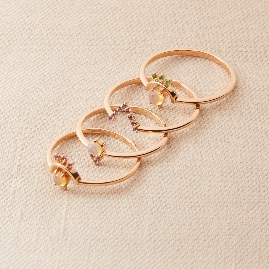 Все украшения Moonka выполнены из серебра и золота и инкрустированы вставками из драгоценных или полудрагоценных камней. В «арсенале» бренда представлены самые разноплановые коллекции: от графических и минималистичных до чувственных и элегантных. Тонкие многоярусные цепи, символичные кулоны-амулеты в виде солнца или хамсы, сотни вариаций на тему наборных колец и колец на фаланги пальцев – всё эти модели уже стали настоящими хитами продаж. А еще изюминкой бренда являются украшения с демантоидом – прозрачным желтовато-зеленым камнем, который также называют «зеленым гранатом». Дизайнеры Moonka создают фантазийные украшения с инкрустацией этого камня: кольца в форме змей, серьги в виде пантер. А еще создатели бренда часто вдохновляются русскими традиционными мотивами: сказками, орнаментом, фольклором. Такой переосмысленный ювелирный патриотизм выглядит максимально интересно, броско и оригинально. Как раз в стиле современных модниц!