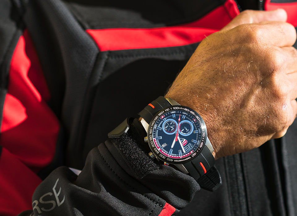 Фактурный хронограф для повседневного ношения. Часы примечательны заводной головкой в форме гоночной покрышки и пушером хронографа в виде рычага тормоза. Корпус выполнен из нержавеющей стали, а перфорированный ремешок — из итальянской натуральной кожи. Люминесцентные стрелки и метки светятся в темноте. Водозащита в 10 атмосфер позволит купаться в часах, в том числе и с маской. Прочность стекла увеличена благодаря закалке.