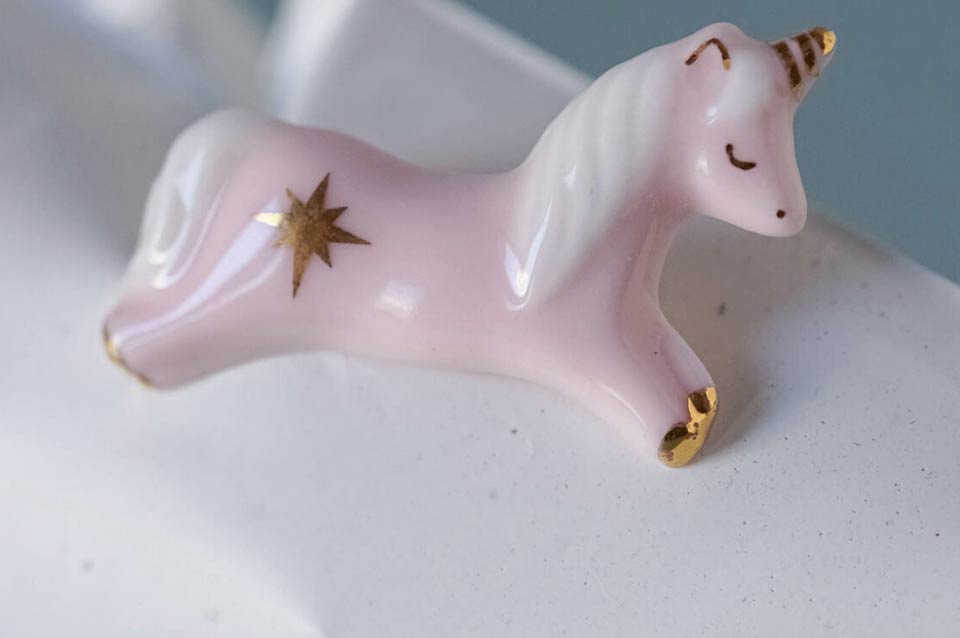 Единорог — нежные броши из глазурованного фарфора с золотыми звёздами.