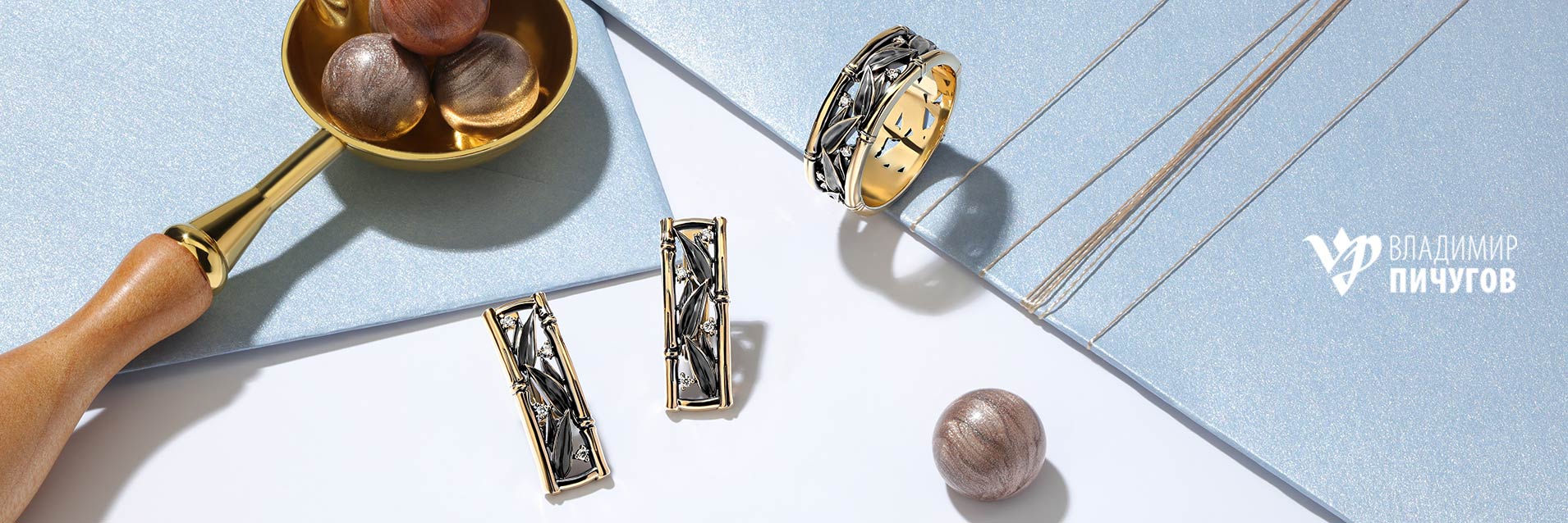 Дизайн ювелирных украшений от Владимира Пичугова универсален — стильные кольца нередко выбирают молодожёны, но по-отдельности эти модели становятся лаконичным дополнением к любому образу. Чёткие линии изделий называют «ювелирной графикой» — это выверенные рисунки геометрических форм с элементами и орнаментами из разных культур. Мастер тщательно сочетает такой символизм с высоким уровнем производства.