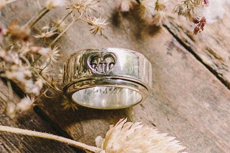 Широкое серебряное колечко с прорезью в форме сердца и надписью Мама на внутренней стороне.