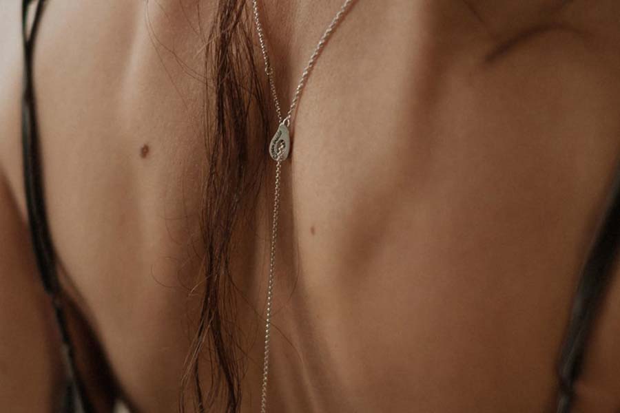 Серия минималистичных изделий — подвеска-галстук и аккуратные серьги-пусеты в форме авокадо в разрезе. Серьги представлены в двух вариантах: без косточки и с позолоченной косточкой.