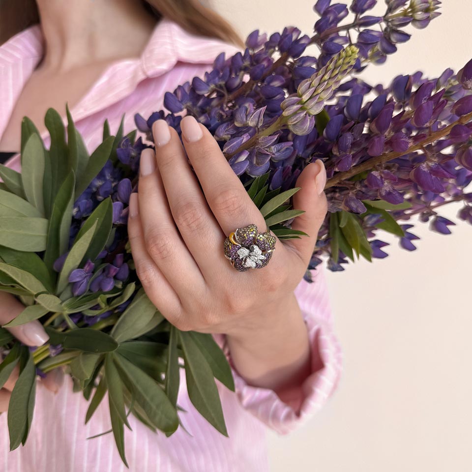 Оригинальное кольцо ''Птицы в гнезде'' выполнено из желтого золота 585 пробы. Изделие дополнено жемчугом, бриллиантами и тсаворитами.
