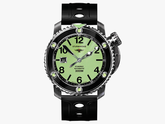 Автоматический калибр Seiko NH-35A, запас хода 41 час. Часы, минуты, секунды, дата. Стальной корпус, диаметр 46 мм, водонепроницаемость 300 м. Минеральное стекло повышенной прочности. Вращающийся в одном направлении безель с люминесцентной разметкой. Зеленый циферблат, люминесцентные стрелки и метки. Силиконовый ремешок.
