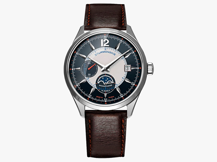 Калибр Полет 310579 с ручным заводом, запас хода 42 часа. Часы, минуты, малая секундная стрелка, дата, фазы Луны. Стальной корпус, диаметр 42 мм, толщина 12 мм, водонепроницаемость 30 м. Бело-синий циферблат. Кожаный ремешок.