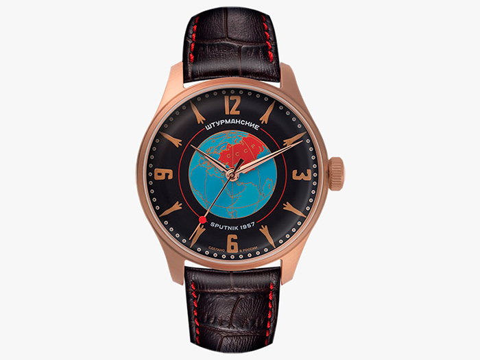 Калибр Полет 2609 с ручным заводом, запас хода 38 часов. Часы, минуты, секунды. Стальной корпус с IP-покрытием цвета розового золота, диаметр 40 мм, толщина 12 мм, водонепроницаемость 50 м. Циферблат с изображением планеты Земля, люминесцентные стрелки. Кожаный ремешок.