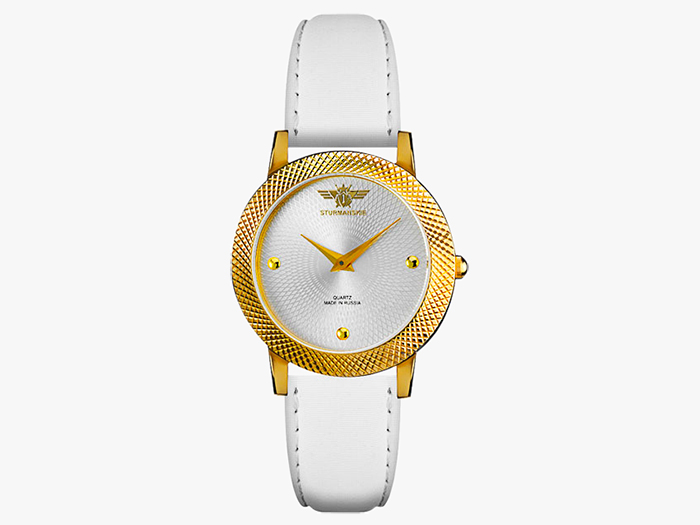 Женская модель. Кварцевый механизм Miyota 2034. Часы и минуты. Стальной корпус с IP-покрытием цвета желтого золота, диаметр 36 мм, толщина 7 мм, водонепроницаемость 30 м. Серебристый гильошированный циферблат. Тканевый ремешок на кожаной подкладке.