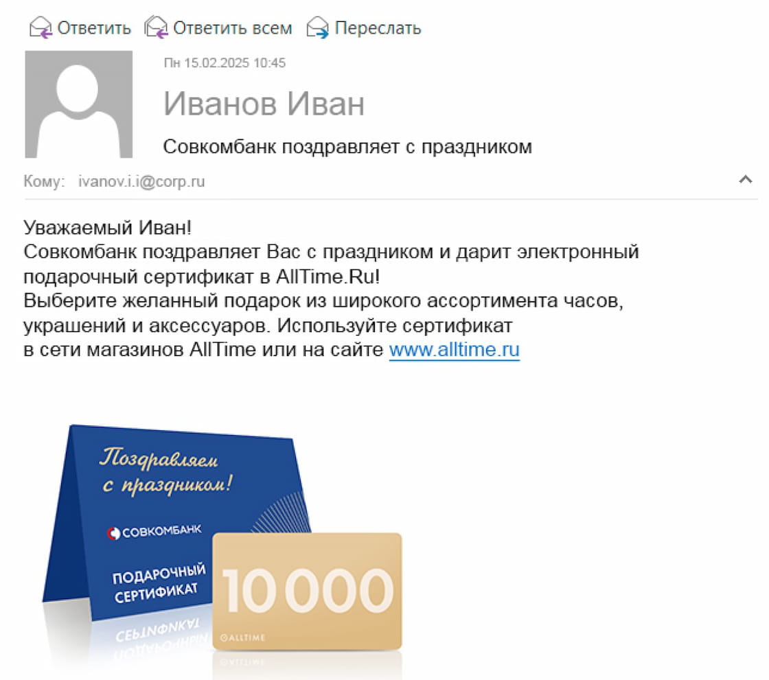 Ваши партнеры оценят подарочные сертификаты AllTime любого номинала с логотипом Вашей компании и в корпоративных цветах Вашего бренда. Мы организуем доставку к вам в офис либо по адресам Ваших клиентов, партнеров или коллег вместе с поздравлениями.