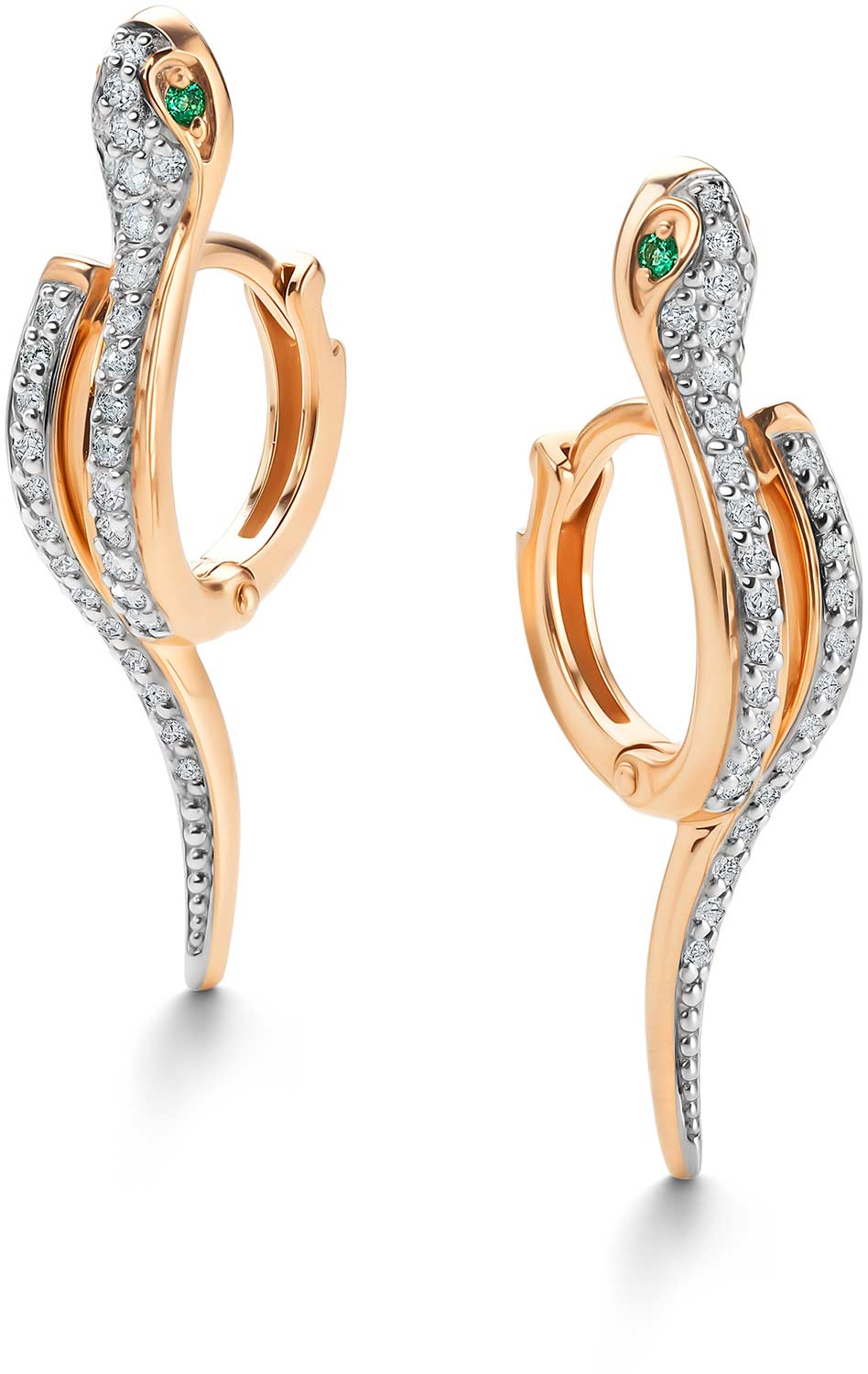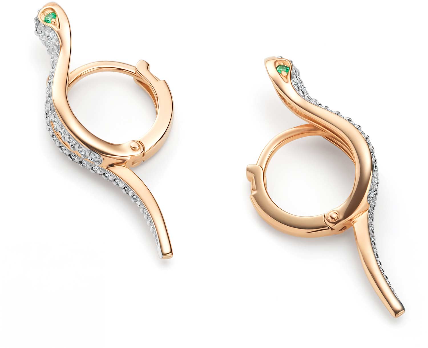 Золотые серьги хаггисы ''Змея'' Алькор 26009-101 с изумрудами, бриллиантами