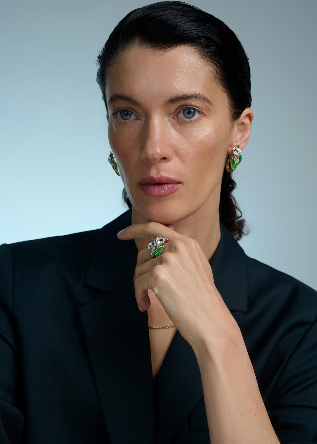 Фото «Золотое кольцо ''Каллы'' БРИЛЛИАНТЫ КОСТРОМЫ 01-2605. с эмалью, зелеными сапфирами, бриллиантами»