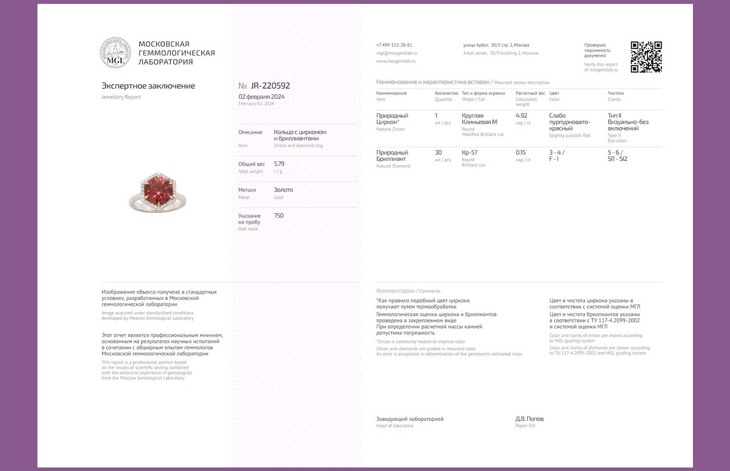 - циркон - 4,92К, бриллиант в 57 граней - 24 шт. - 0,11К, чистота камня 3/6 (цвет, качество), бриллиант в 57 граней - 6шт. - 0,045К, чистота камня 3/6 (цвет, качество)