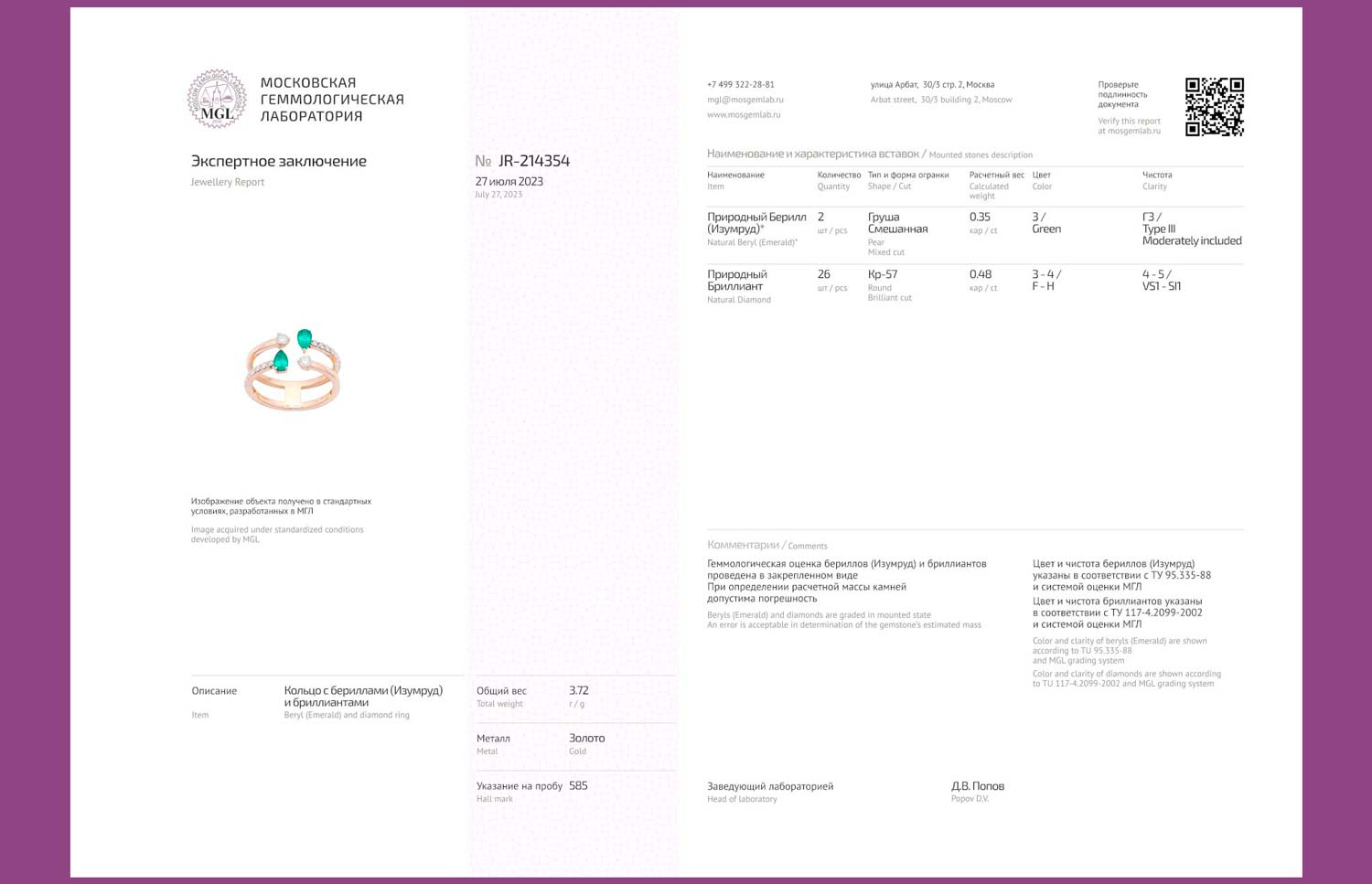 - изумруд - 2шт. - 0,355К, чистота камня 3/2 (цвет, качество), бриллиант - 24шт. в 57 граней - 0,32К, чистота камня 3/5 (цвет, качество), бриллиант - 2шт. в 57 граней - 0,159К, чистота камня 3/6 (цвет, качество)
