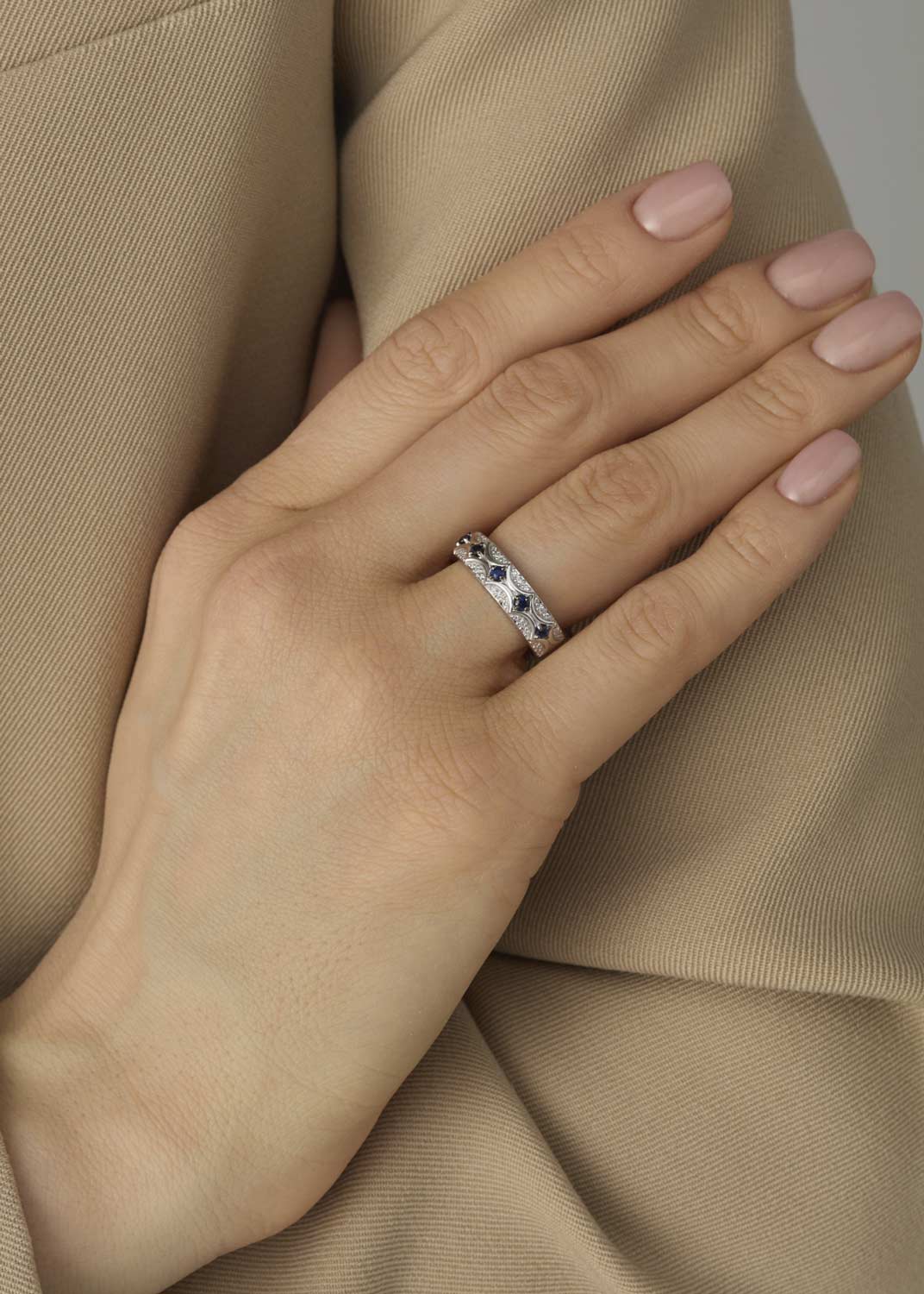 - белое золото, бриллиант, сапфир, вес: для размера 18 - 2,81г.