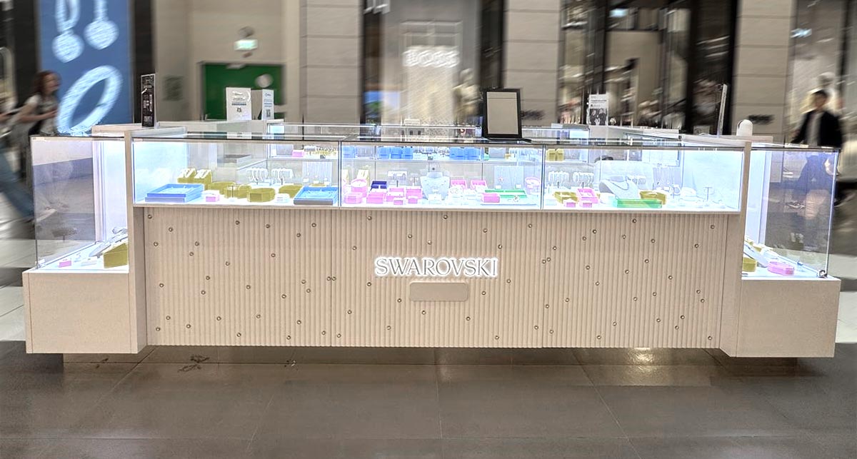 На островном корнере представлены аксессуары, часы Swarovski от 2800 до 84000 Р (46 моделей) и ювелирные украшения Swarovski от 8500 до 55000 Р (421 моделей).