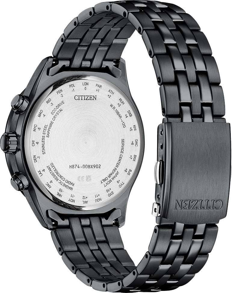 - 24 города, переход на зимнее и летнее время. Автоматический индикатор фаз Луны. Функция переключения отображения фаз Луны между северным и южным полушарием. Ручная калибровка фаз Луны. Циферблат выполнен по технологии Sunray (солнечные лучи) и защищен прочным сапфировым стеклом. Метки в виде штрихов. Окошко даты находится в положении 4 часа. Ретроградный
