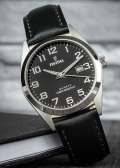 Окошко даты и дня недели находится в положении 3 часа. Рифленая заводная головка. Кожаный ремешок с классической застежкой.