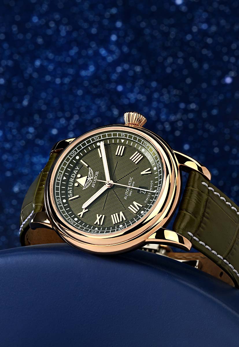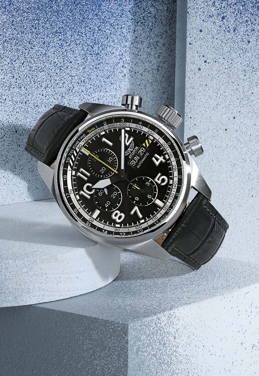 Швейцарская марка AVIATOR, вдохновленная миром авиации и образом жизни авиаторов, продолжает производство точных и надежных часов для людей экстремальных профессий. Все наручные аксессуары имеют яркий, неповторимый дизайн – брутальные корпуса, швейцарский механизм ЕТА внутри и циферблаты темных оттенков, на которых расположены крупные индексы, покрытые светящимся в темноте составом SuperLuminova, и вспомогательные счетчики.