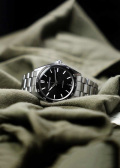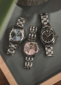 Циферблат выполнен по технологии Sunray (солнечные лучи) и украшен логотипом бренда. Метки в виде штрихов. Завинчивающаяся рифленая заводная головка. Завинчивающаяся прозрачная задняя крышка. Браслет с раскладывающейся застежкой.