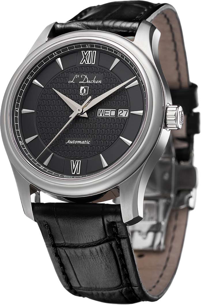 Прозрачная задняя крышка с сапфировым стеклом закреплена на четырех винтах. Сквозь прозрачное окошко можно наблюдать за работой швейцарского механизма Sellita с функцией автоподзавода. Рифленая заводная головка. Удобный ремешок выполнен из натуральной кожи с прошивкой. Раскладывающаяся застежка с фирменным логотипом L'Duchen в виде дубового листа.