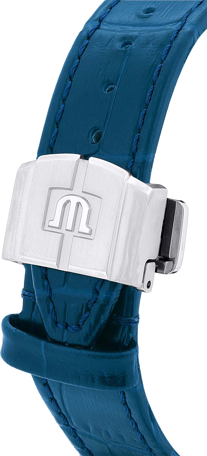 покрытием, которое светится в темноте после непродолжительной зарядки на свету. Окошко даты находится в положении 3 часа. Прозрачная задняя крышка. Граненая заводная головка. Удобный кожаный ремешок с раскладывающейся застежкой украшен логотипом Maurice Lacroix ''M''. Система быстрой замены