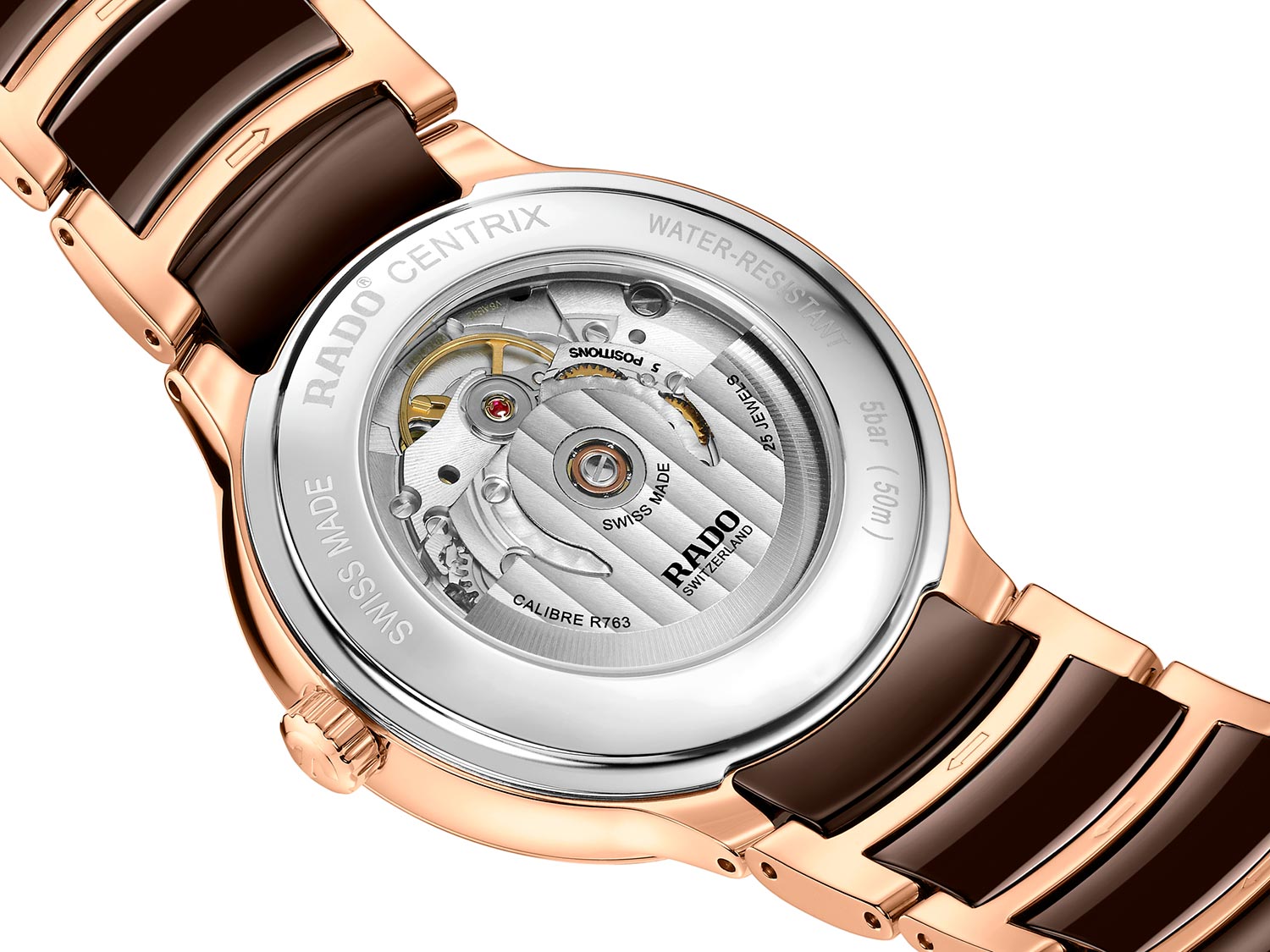 Окошко даты находится в положении 6 часов. Сапфировое стекло закругленной формы. Рифленая заводная головка. Прозрачная задняя крышка. Надежный стальной браслет с вставками из керамики. Раскладывающаяся застежка.