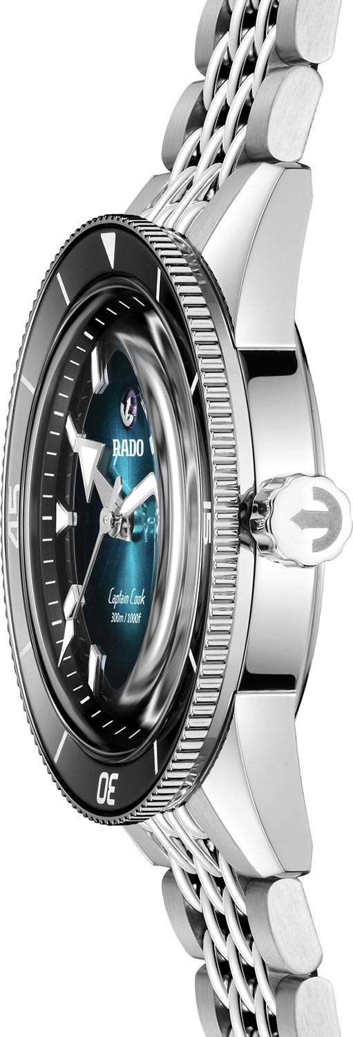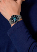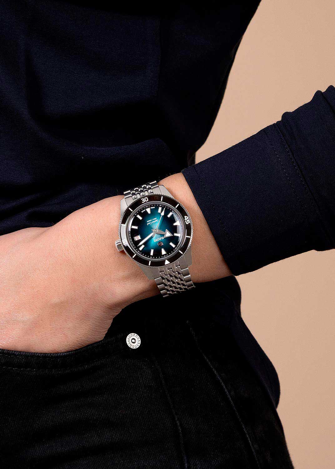 Метки в виде штрихов. Метки и стрелки с люминесцентным покрытием, которое светится в темноте после непродолжительной зарядки на свету. Окошко даты находится в положении 3 часа. Изогнутое сапфировое стекло с двусторонним антибликовым покрытием. Рифленая заводная головка. Завинчивающаяся задняя крышка с гравировкой. Надежный стальной браслет с раскладывающейся застежкой. Система быстрой замены браслета.