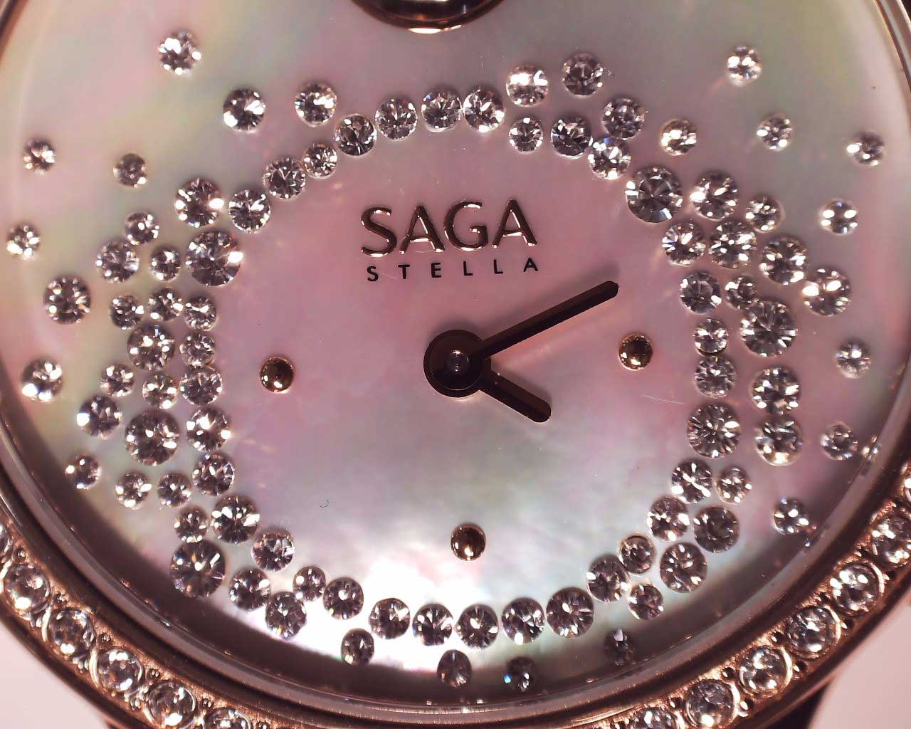 Изумительные женские часы с круглым стальным корпусом, украшенным кристаллами. Циферблат из натурального перламутра с окошком, внутри которого крупный кристалл. Весь циферблат украшен россыпью кристаллов и логотипом Saga. Накладные метки в виде точек. Смещенная рифленая заводная головка. Стальной браслет с раскладывающейся застежкой.
