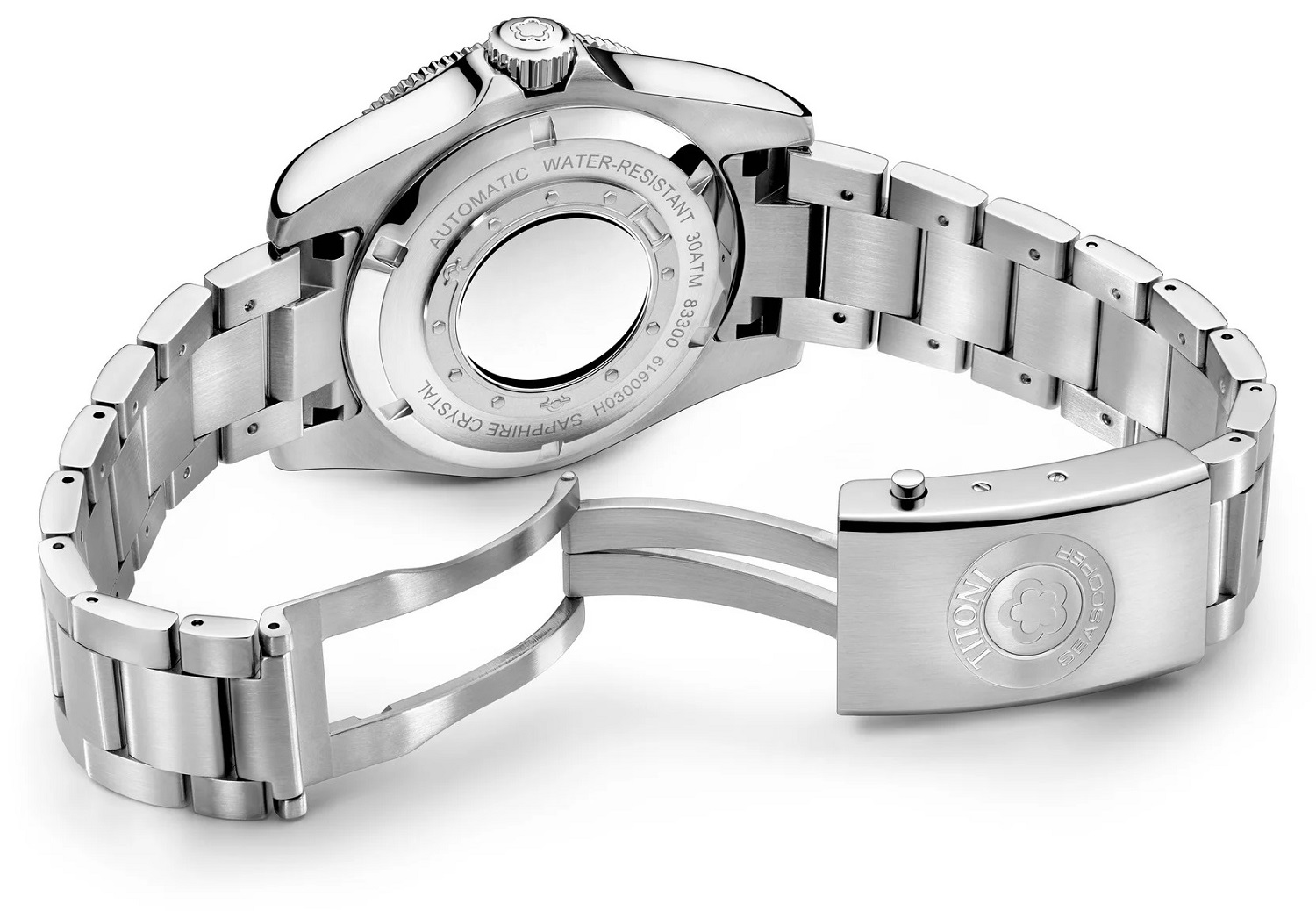 вставкой вращается в одном направлении. Завинчивающаяся заводная головка с защитой и специальной системой прокладок. Задняя крышка украшена объемным изображением иллюминатора, центральная часть которого отполирована до зеркального блеска. Удобный стальной браслет с раскладывающейся застежкой. Система регулировки длины браслета.