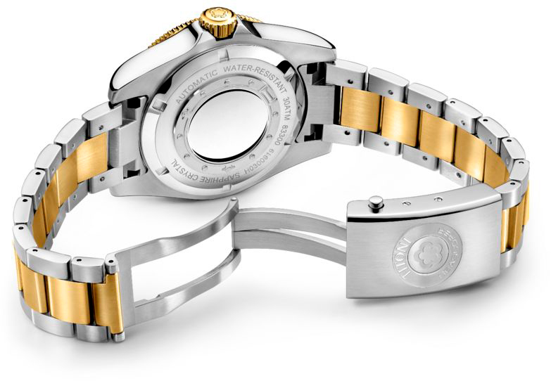Заводная головка оснащена специальной системой уплотнителей, обеспечивающей абсолютную водонепроницаемость часов. Центральная поверхность задней крышки имеет форму иллюминатора и отполирована до зеркального блеска. Сатинированный стальной браслет с частичным PVD покрытием цвета желтого золота и раскладывающейся застежкой, разработанной специально для этой модели. Благодаря продуманному удлиненному корпусу она обеспечивает максимальный комфорт и безопасность при ношении.