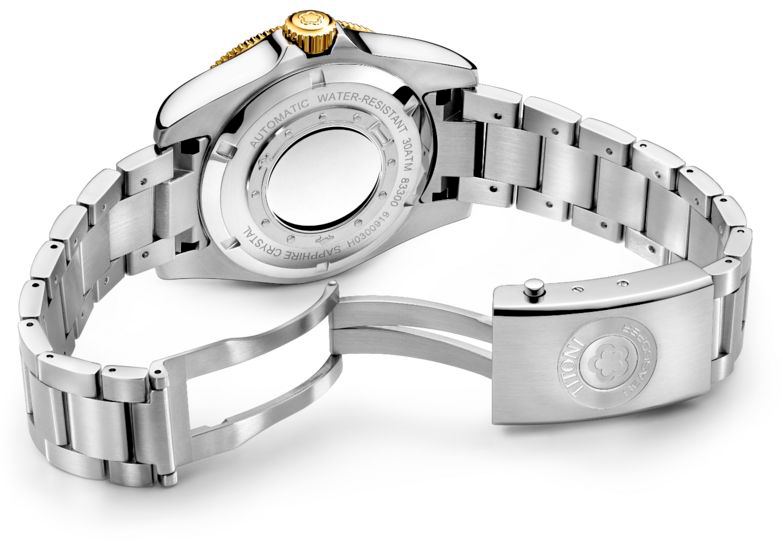 Заводная головка оснащена специальной системой уплотнителей, обеспечивающей абсолютную водонепроницаемость часов. Центральная поверхность задней крышки имеет форму иллюминатора и отполирована до зеркального блеска. Сатинированный стальной браслет с раскладывающейся застежкой, разработанной специально для этой модели. Благодаря продуманному удлиненному корпусу она обеспечивает максимальный комфорт и безопасность при ношении.