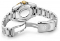 Корпус выполнен из нержавеющей стали с частичным PVD покрытием цвета желтого золота. Рифленый безель с керамической вставкой можно поворачивать против часовой стрелки. Шкала времени погружения на безеле отмечена яркими контрастными цветами с сигнальным треугольником в положении 12 часов. Внутри треугольной нулевой отметки находится светящаяся точка, которая позволяет легко считывать время даже в темной и мутной воде.